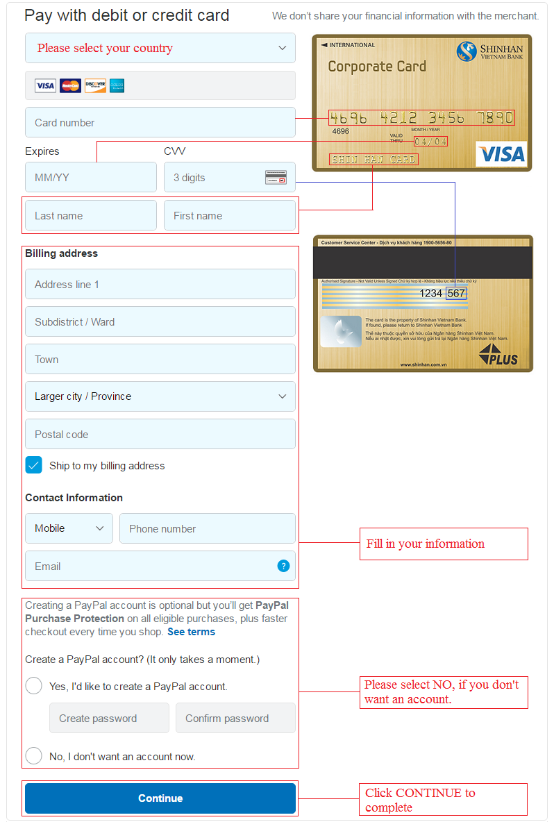 Definitely, you can make the payment via Paypal even when you have no Paypal account or you don’t want a Paypal account. Please select option 2: "Pay with my Debit or Credit Card" in order to complete the transaction with the international payment cards such as: Visa Credit Card, Visa Debit Card.