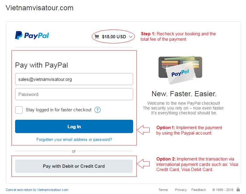 Option 1: Implement the payment by using the Paypal account: